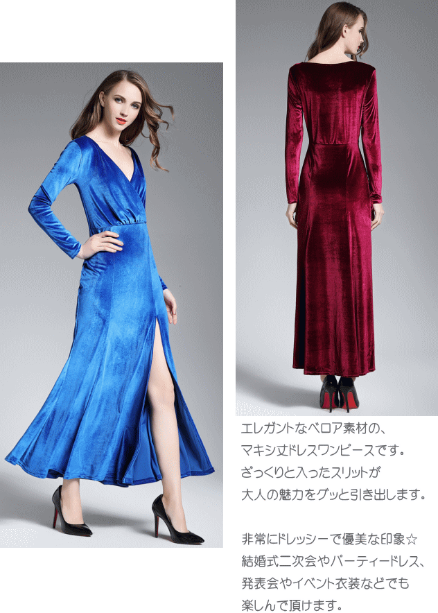 【在庫限定50%OFF】マキシワンピース ベロア マキシ丈 ロングワンピース サイドスリット 長袖 Aライン フレア 無地 結婚式 二次会 春 秋 冬 レディース 送料無料 (アパレル)