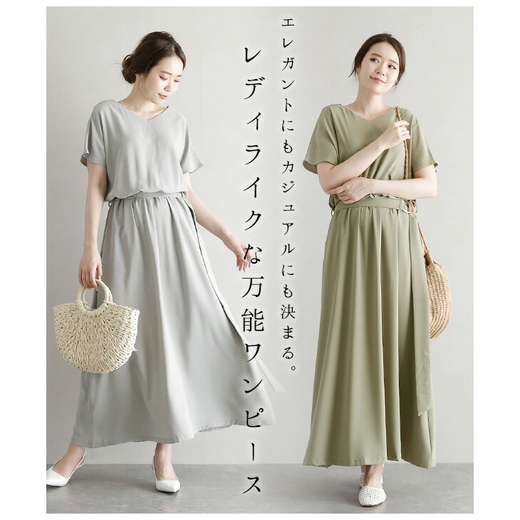 ベルト付 ワンピース Vネック ロング 半袖 レディース マキシ丈 とろみ ウエストゴム Aライン シンプル 大人 おしゃれ 可愛い メール便 2020春夏新作 フリー 【lgww-af0602】【即納:2-5日】【送料無料】メ込